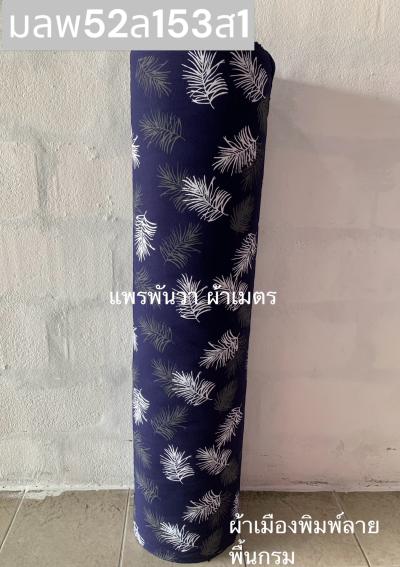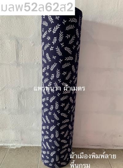 ผ้าเมืองพิมพ์ลาย-พื้นสี พื้นกรม ลายใบไม้ สีขาวนวล