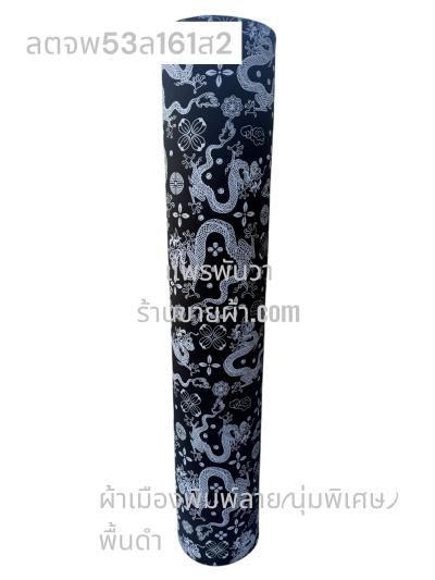ผ้าลายตรุษจีน พื้นดำ ลายมังกรยาว สีขาวนวล