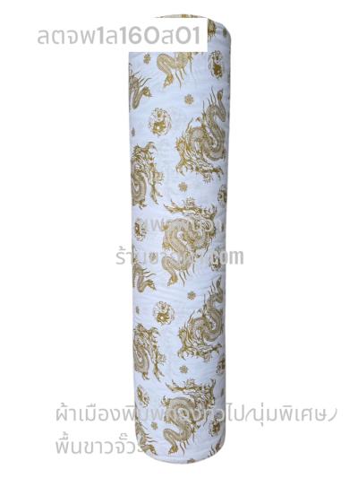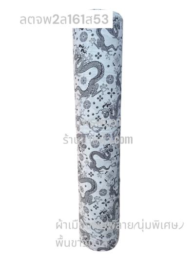 ผ้าลายตรุษจีน พื้นขาวจั๊วะ ลายมังกรใหญ่ สีพิมพ์ทองทั่วไป