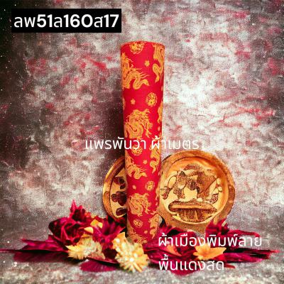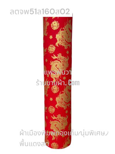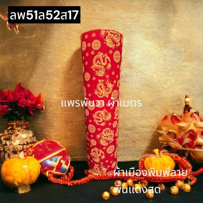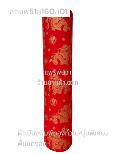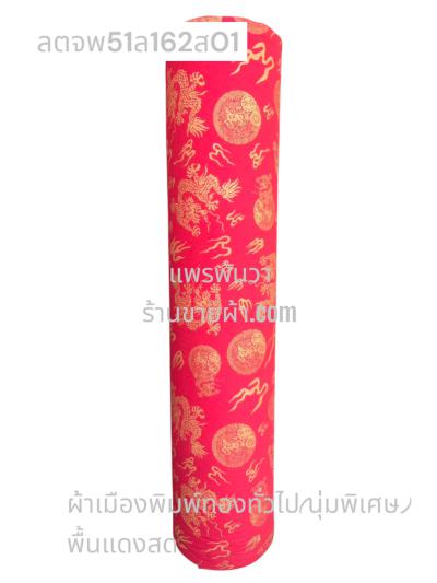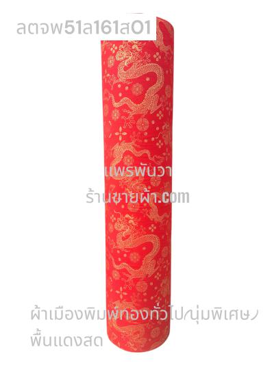 ผ้าลายตรุษจีน พื้นแดงสด ลายมังกรยาว สีพิมพ์ทองทั่วไป