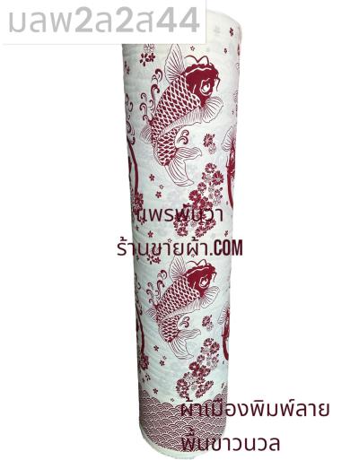 ผ้าลายตรุษจีน พื้นขาวนวล ลายปลาคราฟ สีแดงเลือดนก