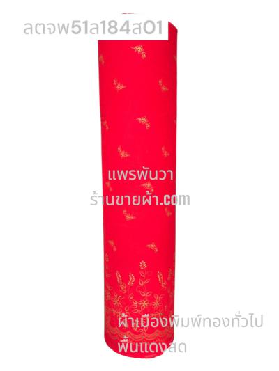 ผ้าลายตรุษจีน พื้นแดงสด ลายแดงใบเฟิร์น สีพิมพ์ทองทั่วไป