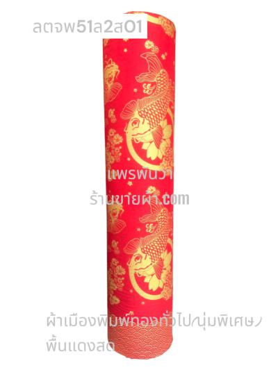 ผ้าลายตรุษจีน พื้นแดงสด ลายปลาคราฟ สีพิมพ์ทองเต็ม