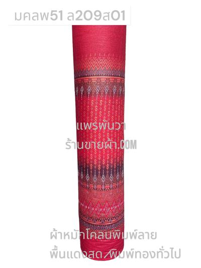 ผ้าหมักโคลน(พุ่งด้ายดำ)พิมพ์ลาย พื้นแดงสด ลายsเล็ก สีพิมพ์ทองทั่วไป