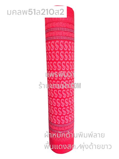 ผ้าหมักโคลน(พุ่งด้ายดำ)พิมพ์ลาย พื้นแดงสด ลายลายขอ S สีขาวนวล