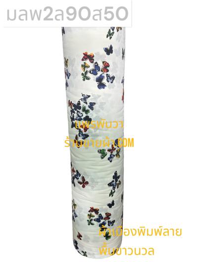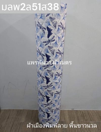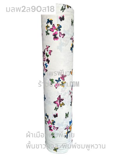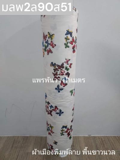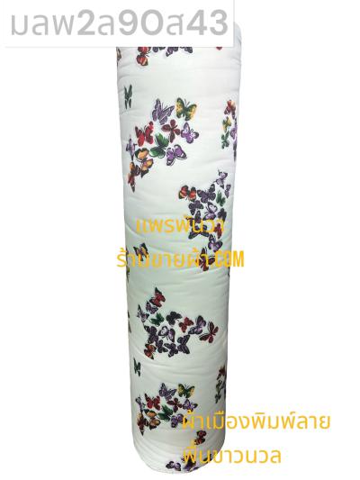 ผ้าเมืองพิมพ์ลาย(นุ่มพิเศษ)พื้นขาว พื้นขาวนวล ลายผีเสื้อหลากสี สีน้ำเงิน