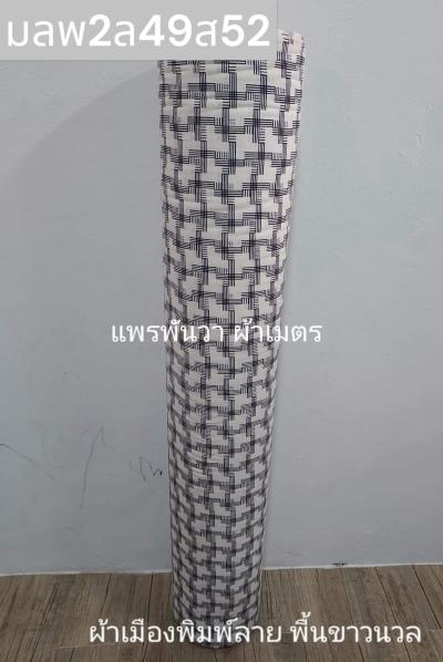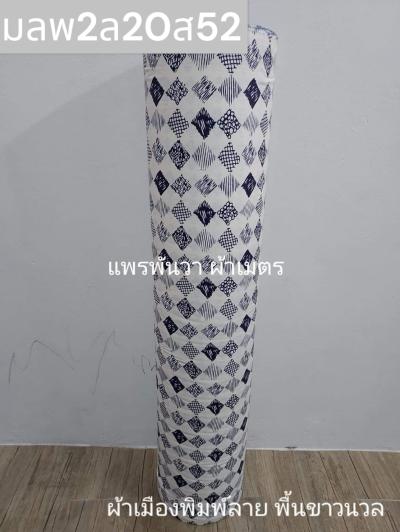 ผ้าเมืองพิมพ์ลาย(นุ่มพิเศษ)พื้นขาว พื้นขาวนวล ลายสี่เหลี่ยม สีกรม