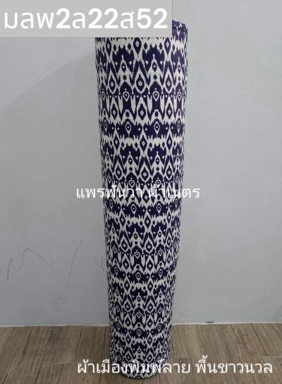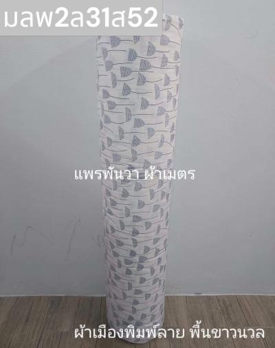 ผ้าเมืองพิมพ์ลาย(นุ่มพิเศษ)พื้นขาว พื้นขาวนวล ลายใบพัด สีกรม
