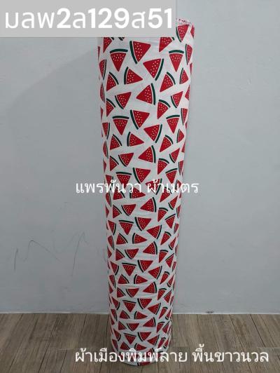 ผ้าเมืองพิมพ์ลาย(นุ่มพิเศษ)พื้นขาว พื้นขาวนวล ลายแตงโม สีแดงสด