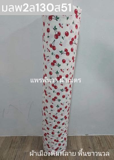 ผ้าเมืองพิมพ์ลาย(นุ่มพิเศษ)พื้นขาว พื้นขาวนวล ลายเชอร์รี่ สีแดงสด