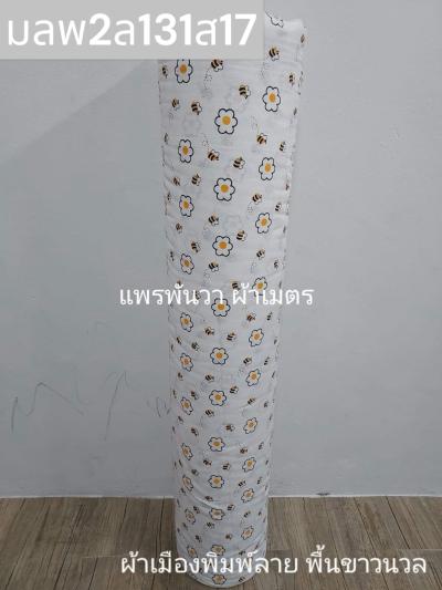 ผ้าเมืองพิมพ์ลาย(นุ่มพิเศษ)พื้นขาว พื้นขาวนวล ลายผึ้ง สีเหลืองทอง