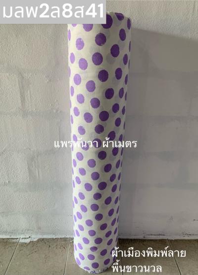 ผ้าเมืองพิมพ์ลาย(นุ่มพิเศษ)พื้นขาว พื้นขาวนวล ลายวงกลมแตก สีม่วงเผือก