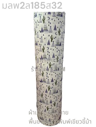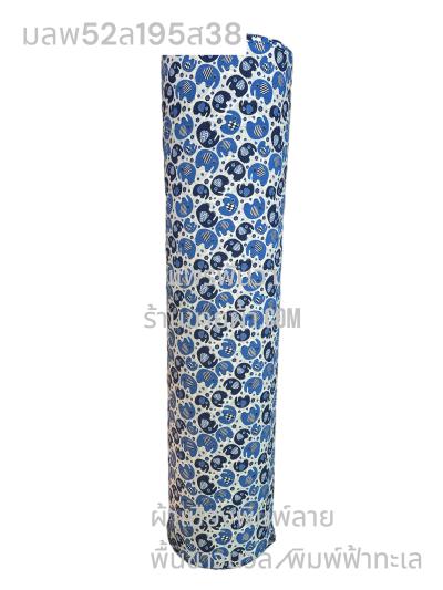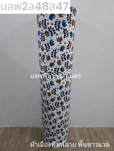 ผ้าเมืองพิมพ์ลาย-พื้นขาว พื้นขาวนวล ลายลูกช้าง สีฟ้าทะเล