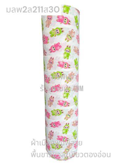 ผ้าเมืองพิมพ์ลาย-พื้นขาว พื้นขาวนวล ลายลายลาบูบู้ สีเขียวตองอ่อน
