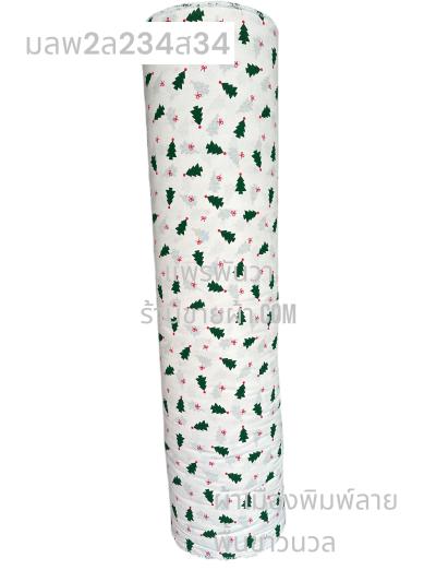 ผ้าเมืองพิมพ์ลาย-พื้นขาว พื้นขาวนวล ลายต้นสนคริสต์มาส สีเขียวเข้ม