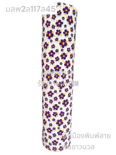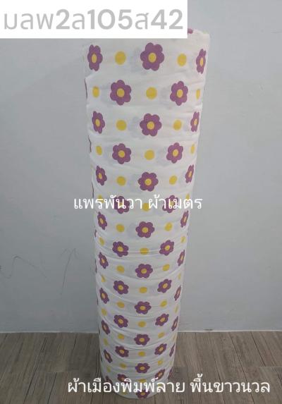 ผ้าเมืองพิมพ์ลาย-พื้นขาว พื้นขาวนวล ลายดอกดวง สีม่วงเข้ม