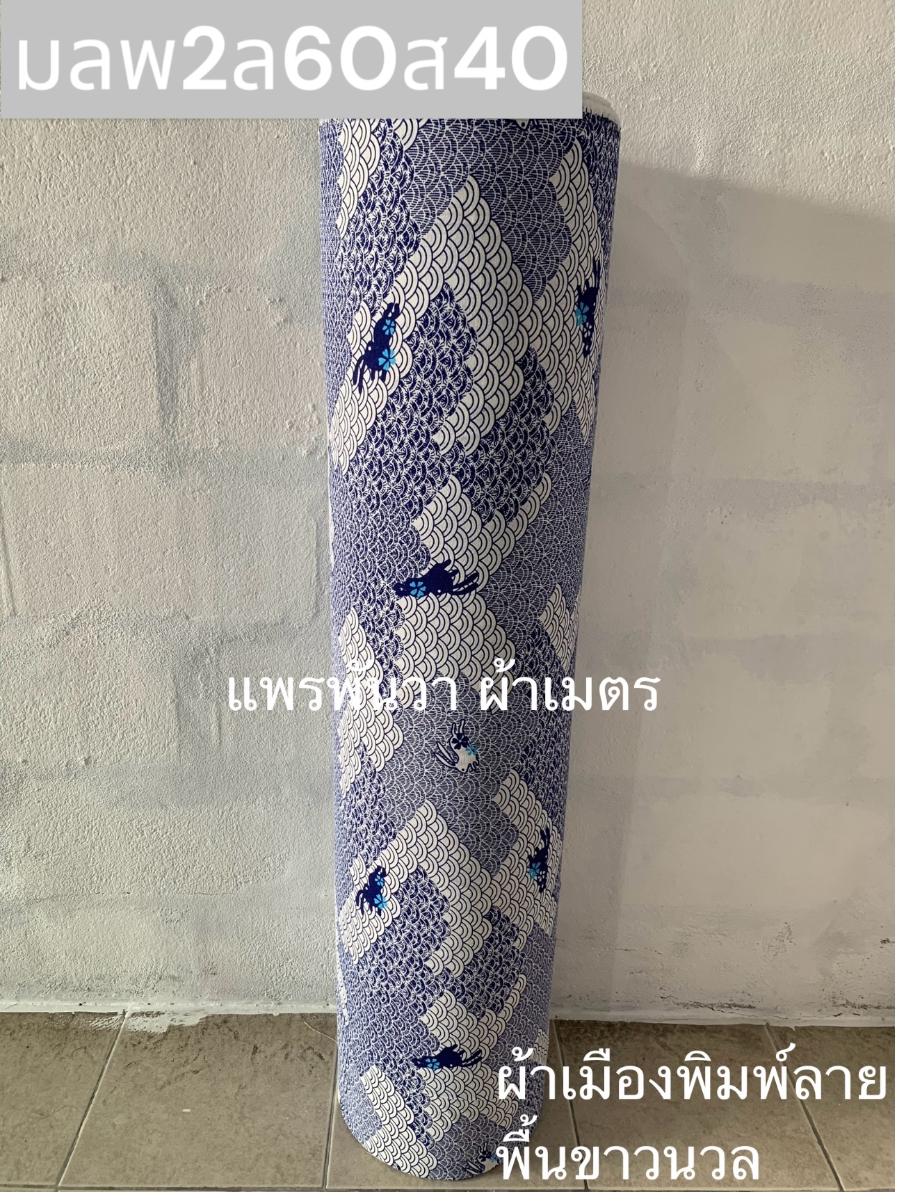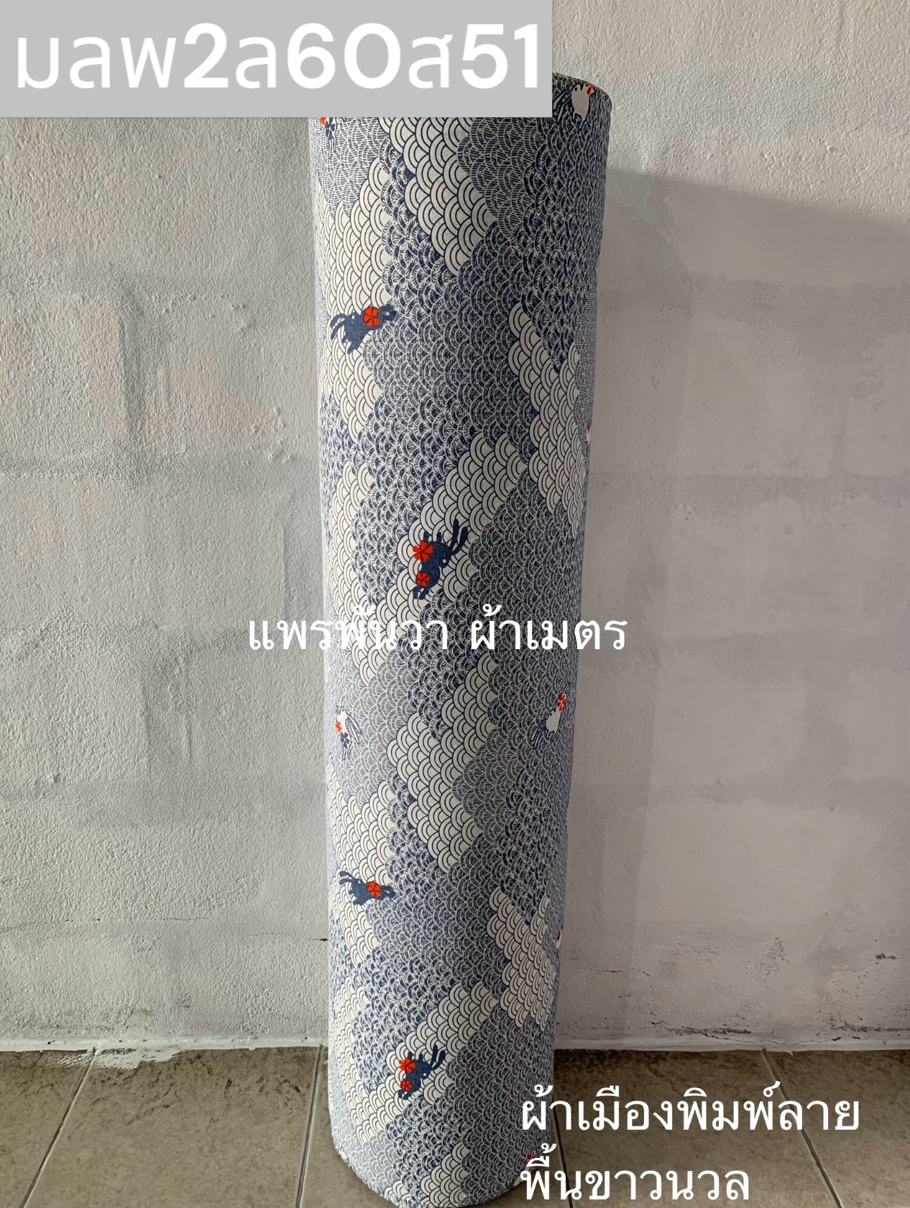 ผ้าเมืองพิมพ์ลาย-พื้นขาว พื้นขาวนวล ลายกระต่ายคลื่น สีฟ้าสด