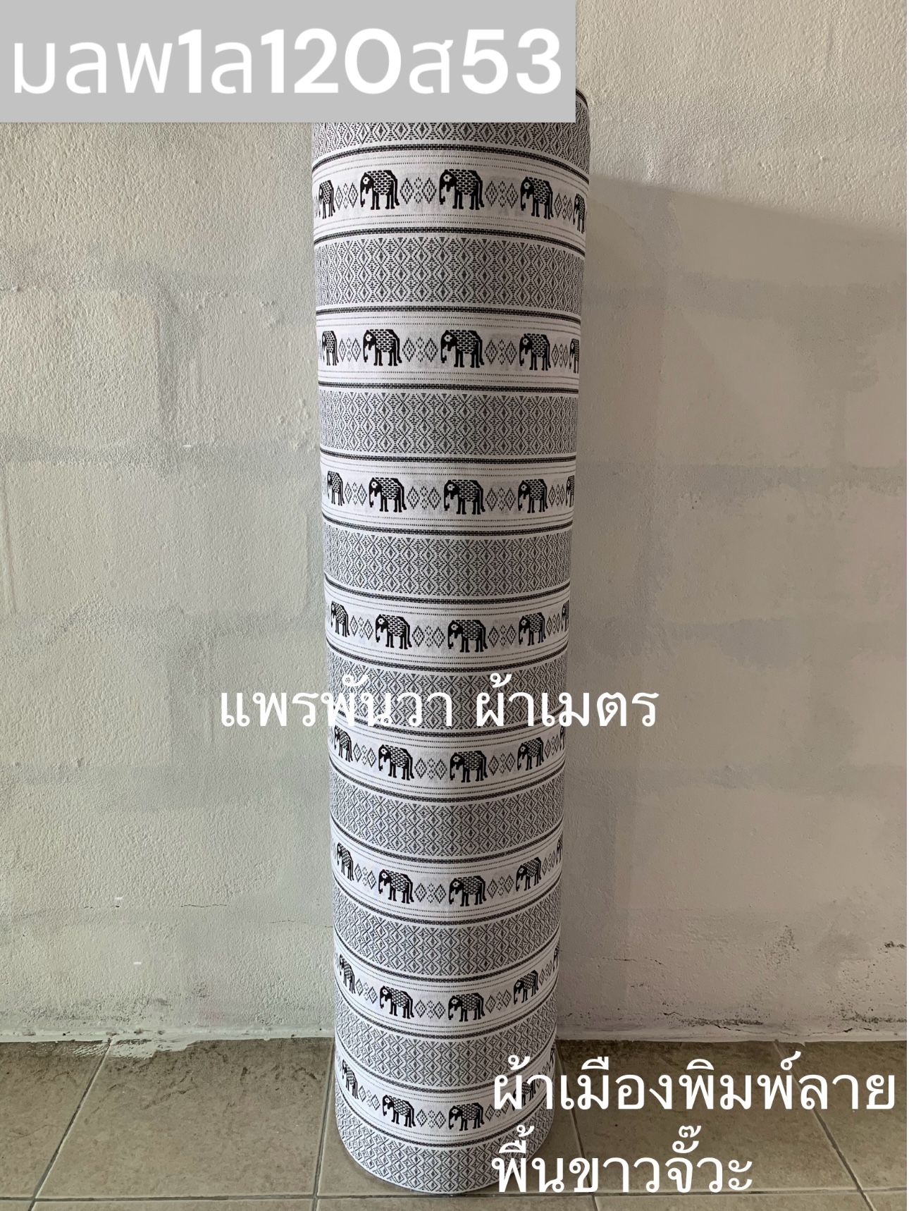 ผ้าเมืองพิมพ์ลาย-พื้นขาว พื้นขาวจั๊วะ ลายช้างผอม สีดำ