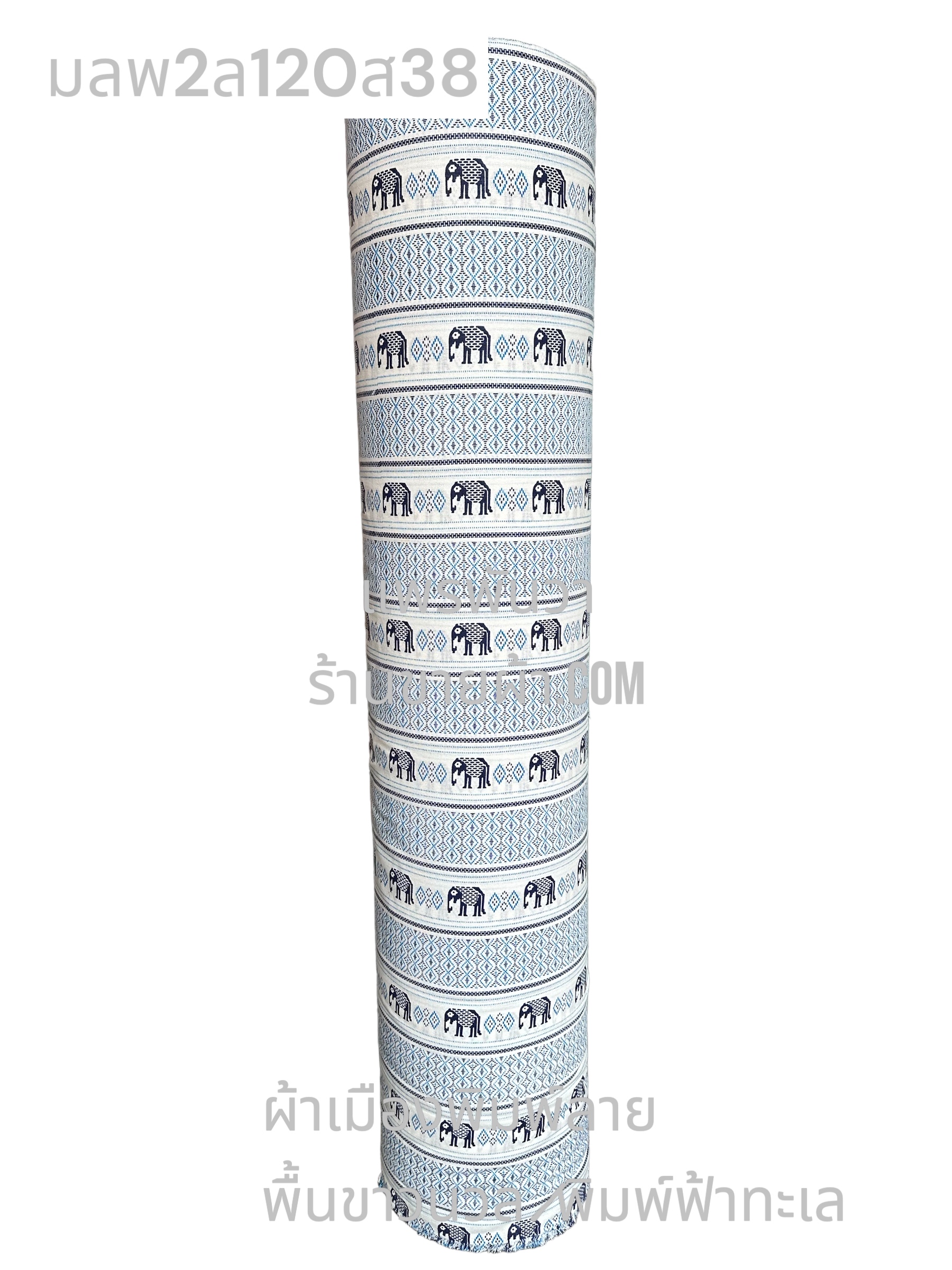 ผ้าเมืองพิมพ์ลาย-พื้นขาว พื้นขาวจั๊วะ ลายช้างผอม สีฟ้าทะเล