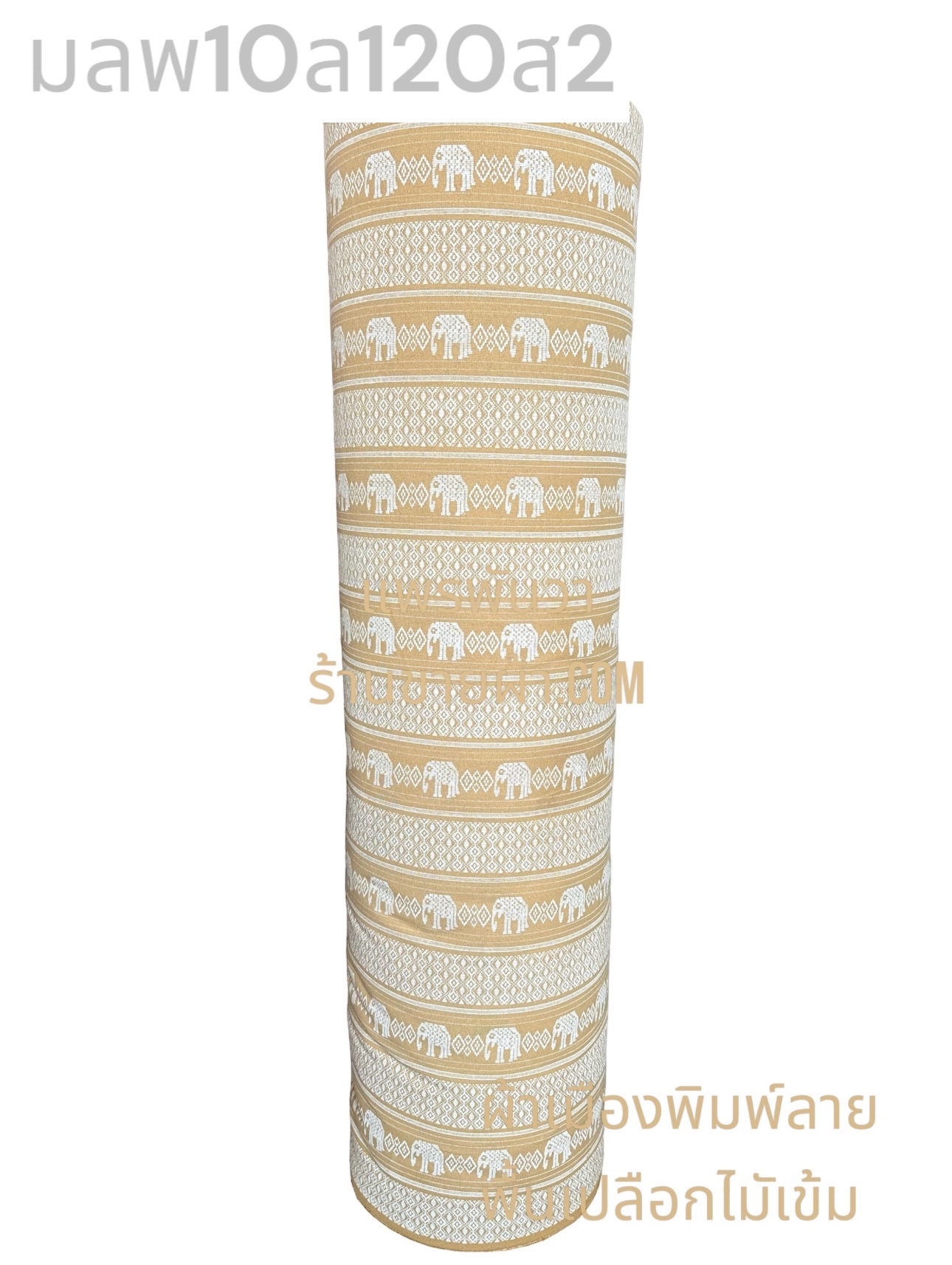 ผ้าเมืองพิมพ์ลาย-พื้นสี พื้นเปลือกไม้เข้ม ลายช้างผอม สีขาวนวล