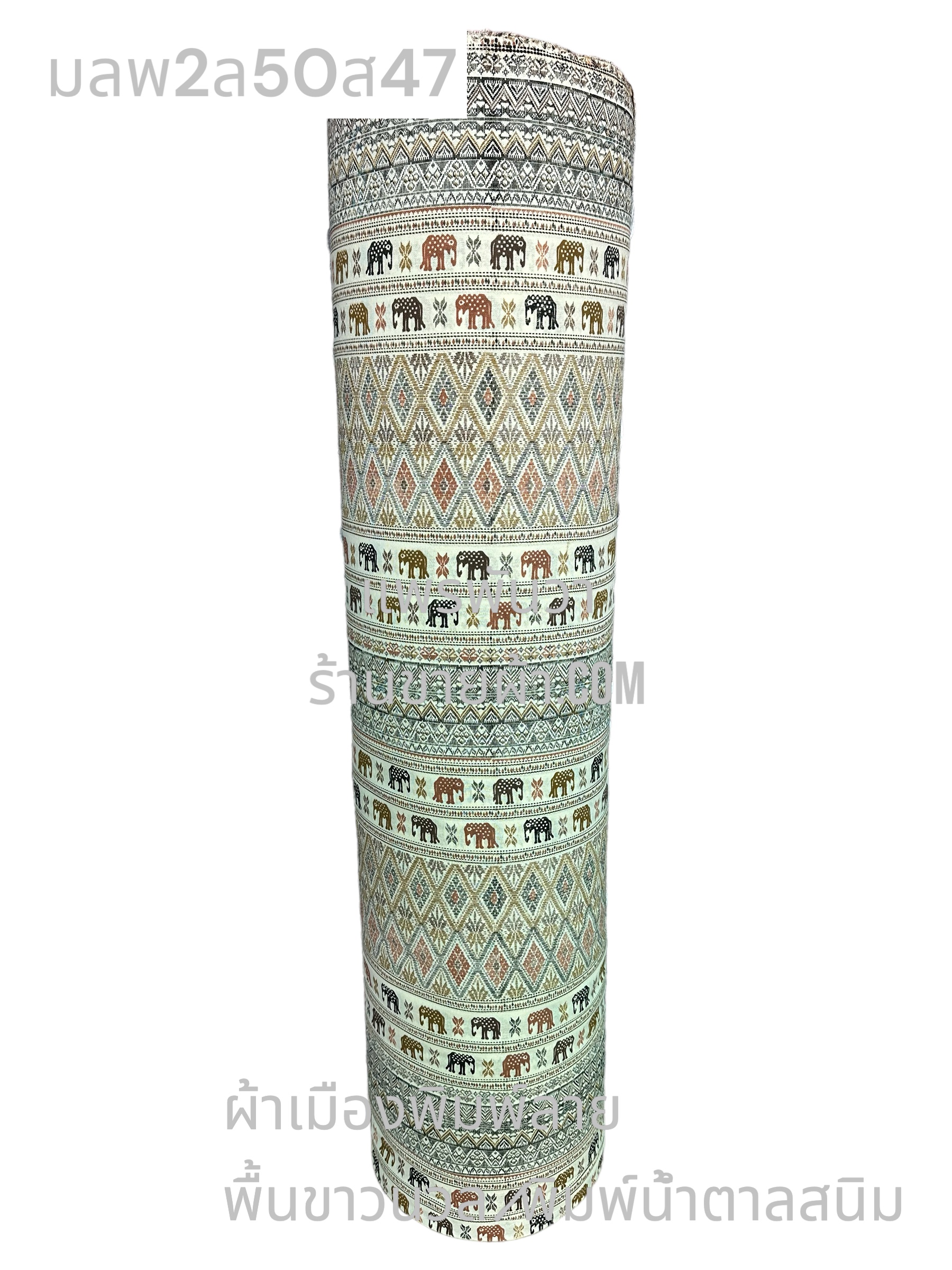 ผ้าเมืองพิมพ์ลาย-พื้นขาว พื้นขาวนวล ลายช้างผ้าใหม สีน้ำตาลสนิม