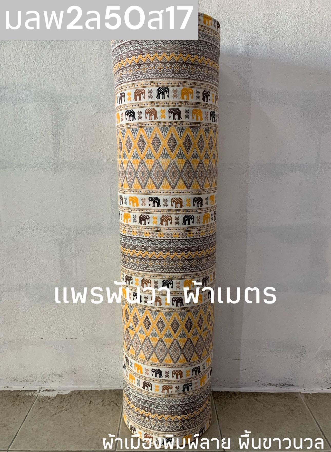 ผ้าเมืองพิมพ์ลาย-พื้นขาว พื้นขาวนวล ลายช้างผ้าใหม สีเหลืองทอง