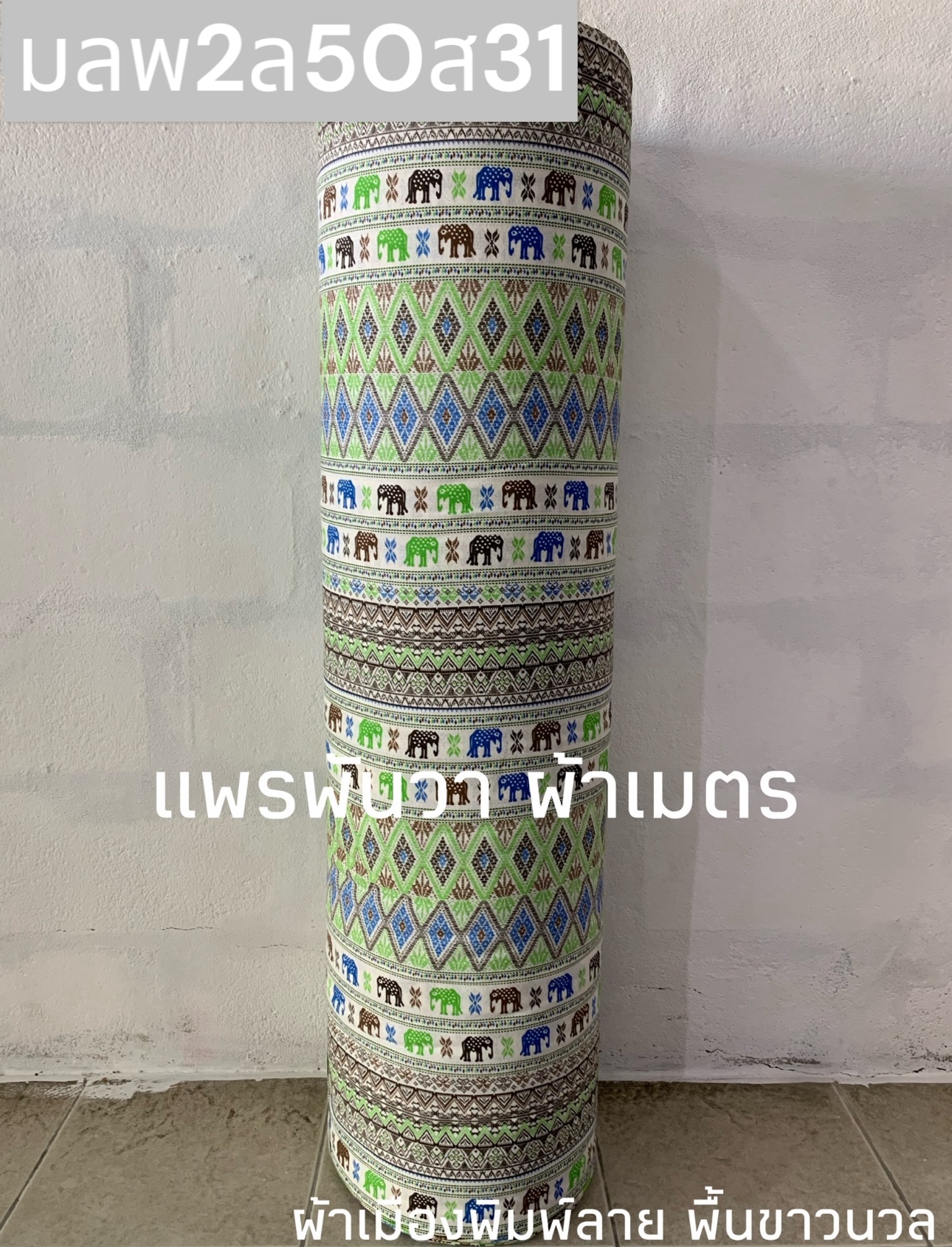 ผ้าเมืองพิมพ์ลาย-พื้นขาว พื้นขาวนวล ลายช้างผ้าใหม สีเขียวตองเข้ม