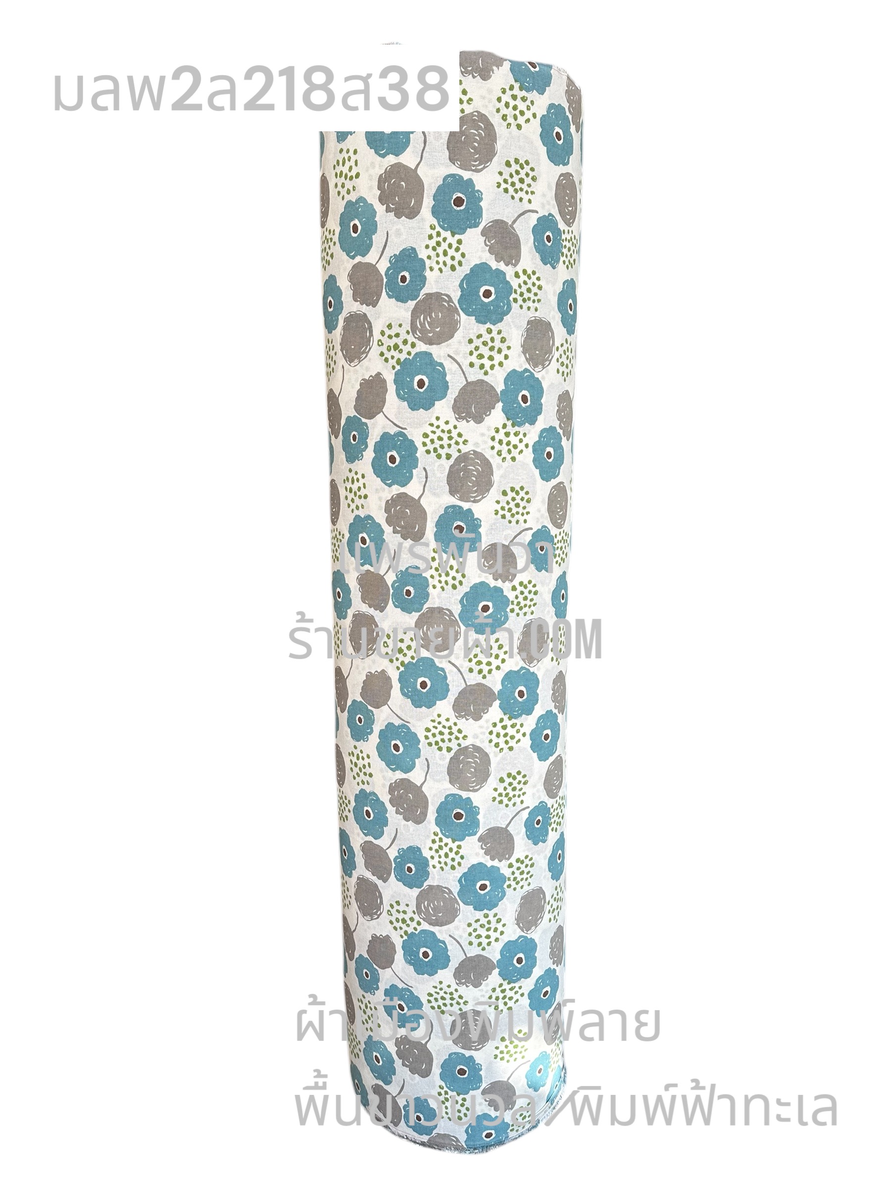 ผ้าลายดอกสงกรานต์ พื้นขาวนวล ลายดอกเยอบีร่า สีฟ้าทะเล