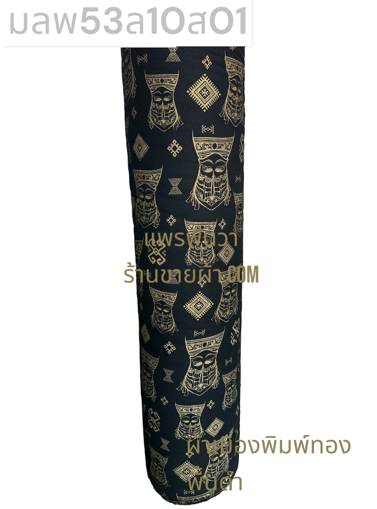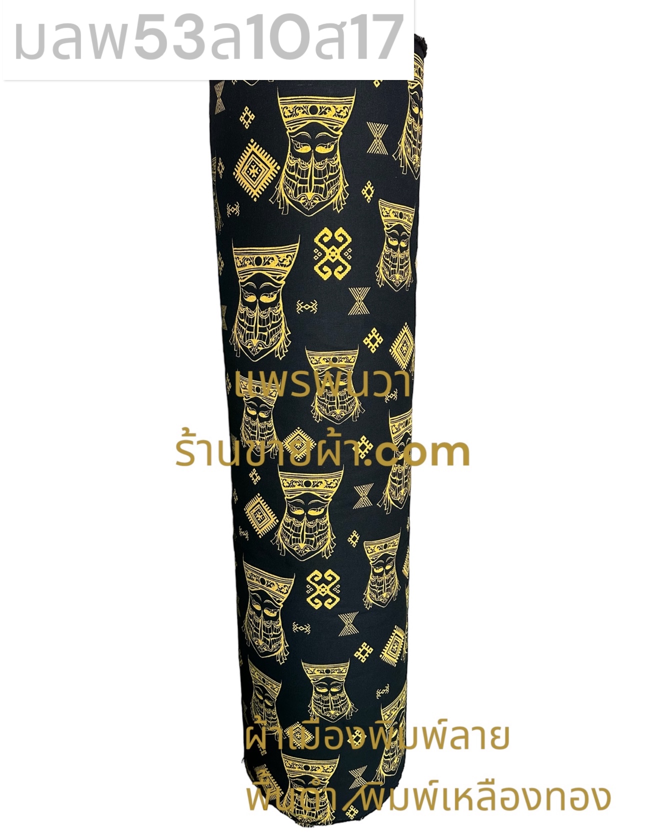 ผ้าเมืองพิมพ์ลาย-พื้นสี พื้นดำ ลายผีตาโขน สีพิมพ์ทองทั่วไป