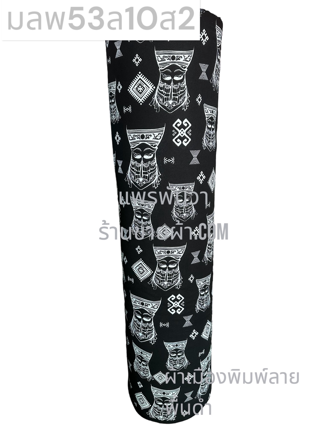 ผ้าเมืองพิมพ์ลาย-พื้นสี พื้นดำ ลายผีตาโขน สีขาวนวล