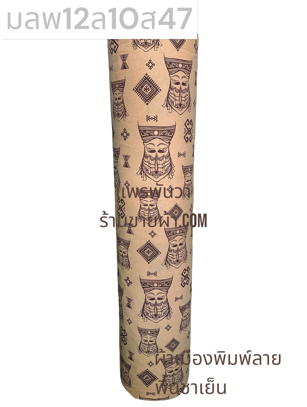 ผ้าเมืองพิมพ์ลาย-พื้นสี พื้นชาเย็น ลายผีตาโขน สีน้ำตาลสนิม