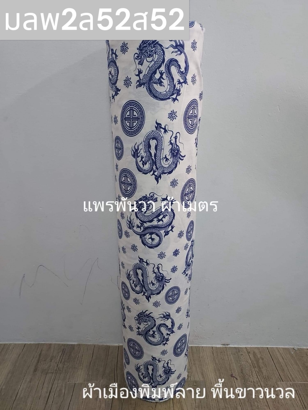 ผ้าเมืองพิมพ์ลาย-พื้นขาว พื้นขาวนวล ลายมังกรลูกแก้ว สีกรม