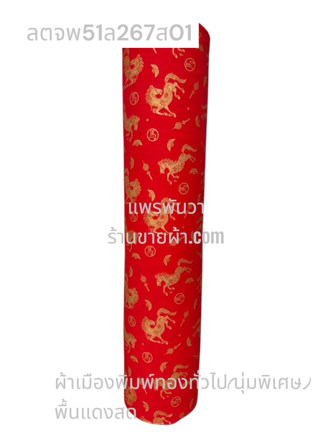 ผ้าลายตรุษจีน พื้นแดงสด ลายม้าเงินตำลึง สีพิมพ์ทองทั่วไป