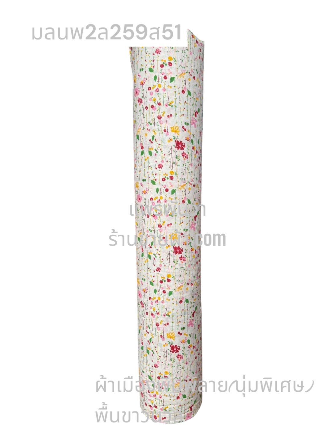 ผ้าเมืองพิมพ์ลาย(นุ่มพิเศษ)พื้นขาว พื้นขาวนวล ลายลายดอกดาหลา สีแดงสด