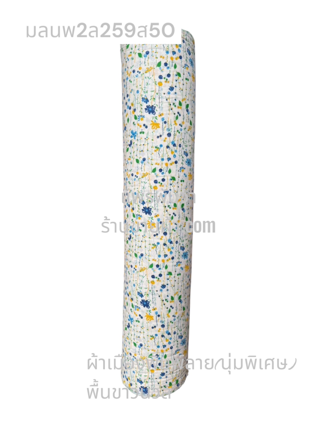 ผ้าเมืองพิมพ์ลาย(นุ่มพิเศษ)พื้นขาว พื้นขาวนวล ลายลายดอกดาหลา สีน้ำเงิน