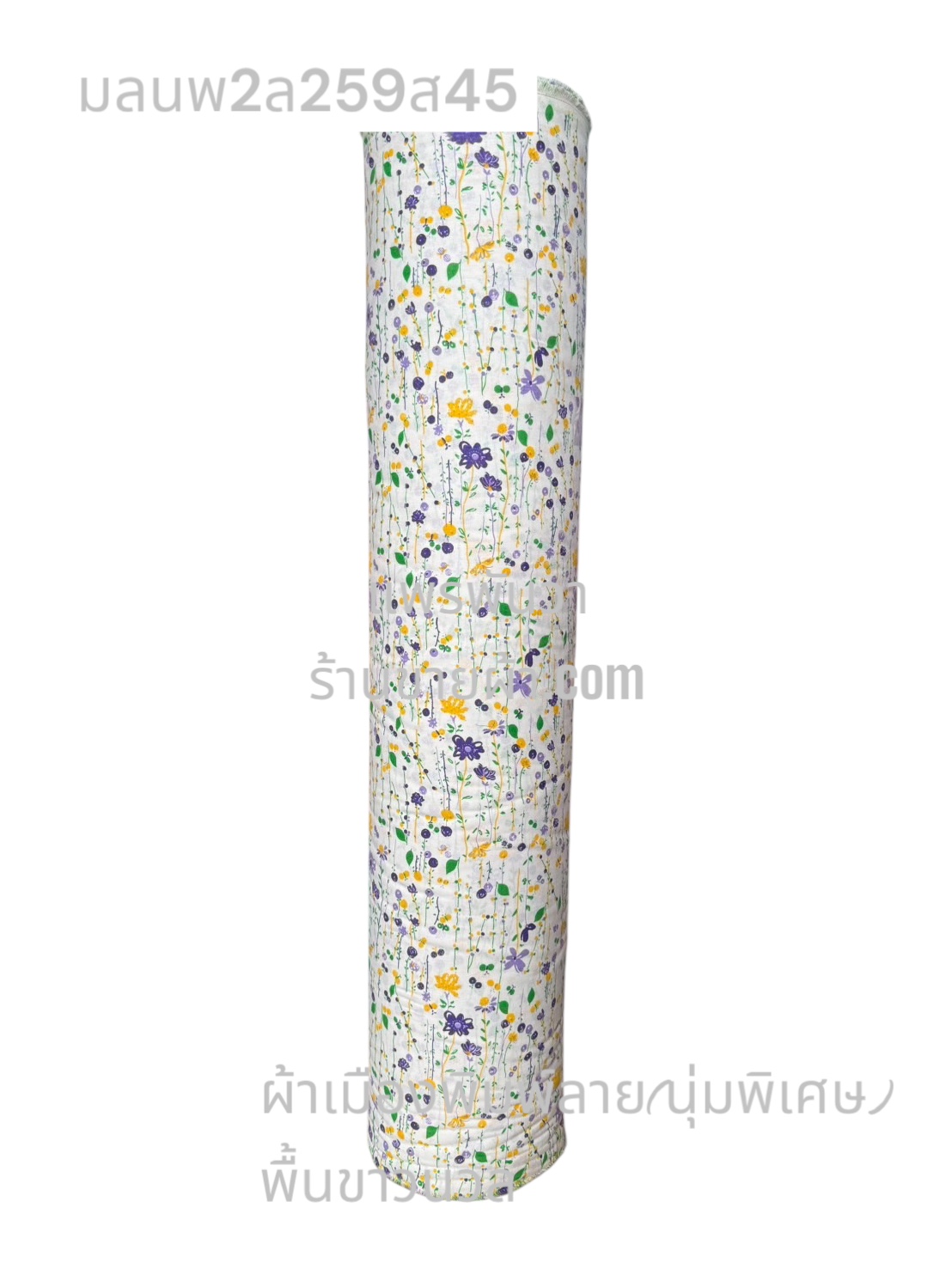 ผ้าเมืองพิมพ์ลาย(นุ่มพิเศษ)พื้นขาว พื้นขาวนวล ลายลายดอกดาหลา สีม่วงเข้ม