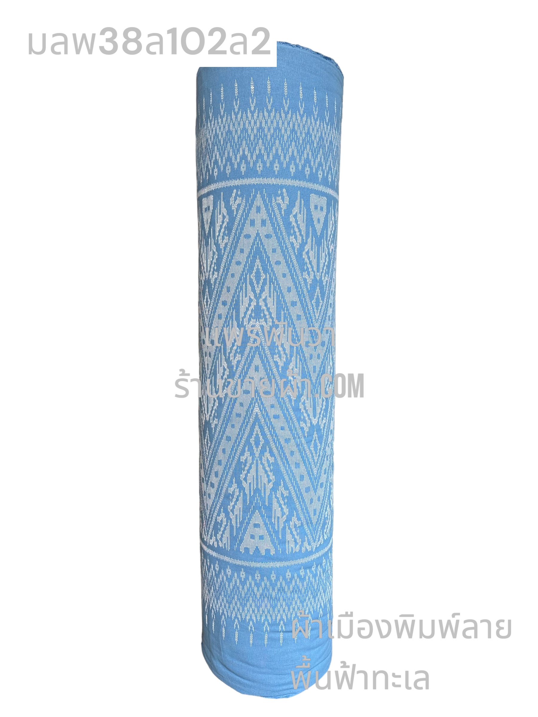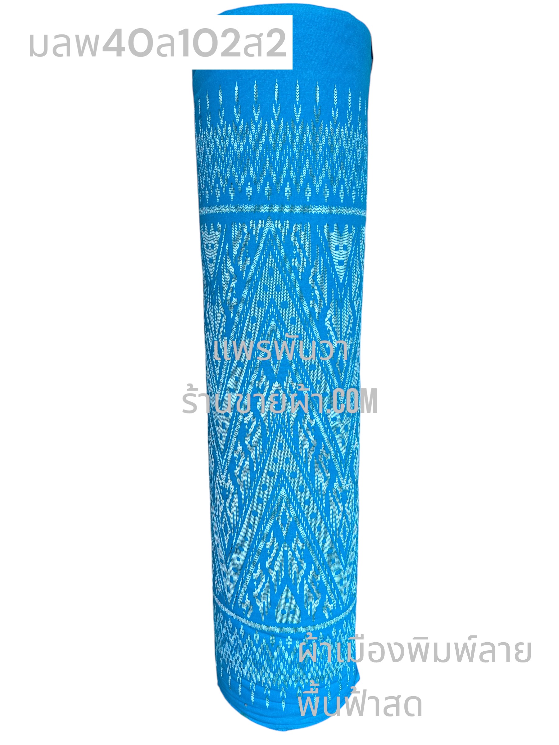 ผ้าเมืองพิมพ์ลาย-พื้นสี พื้นฟ้าสด ลายลิซ่า สีขาวนวล