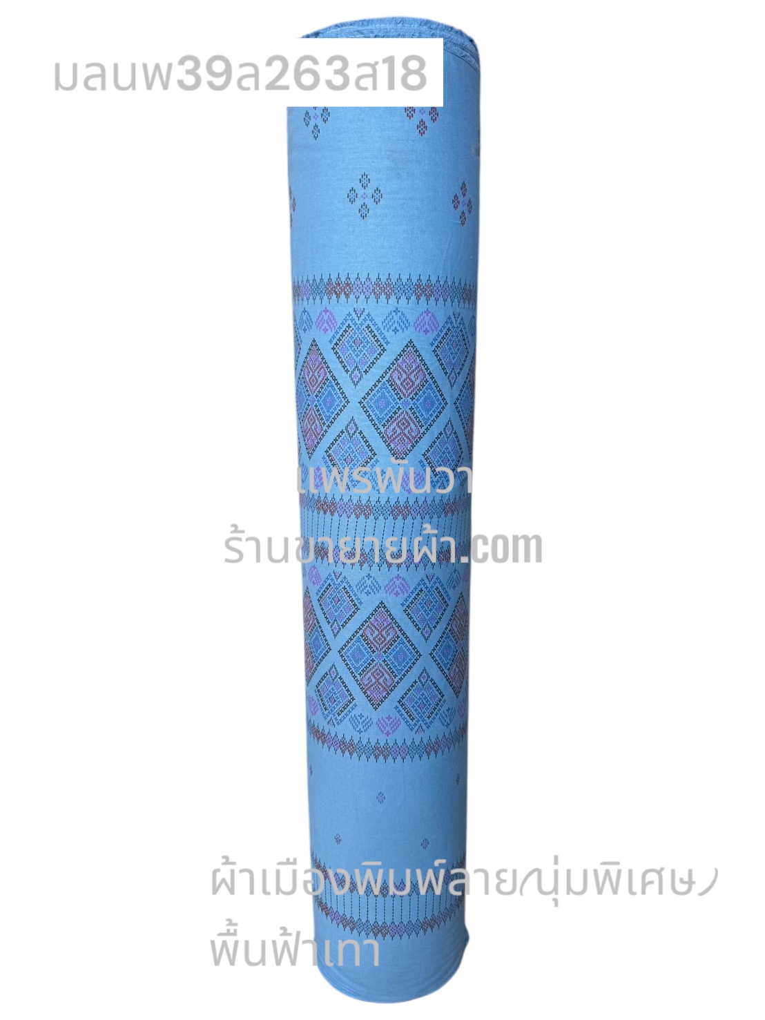 ผ้าเมืองพิมพ์ลาย(นุ่มพิเศษ)พื้นสี พื้นฟ้าอ่อน ลายเพชรชมพู สีชมพูหวาน